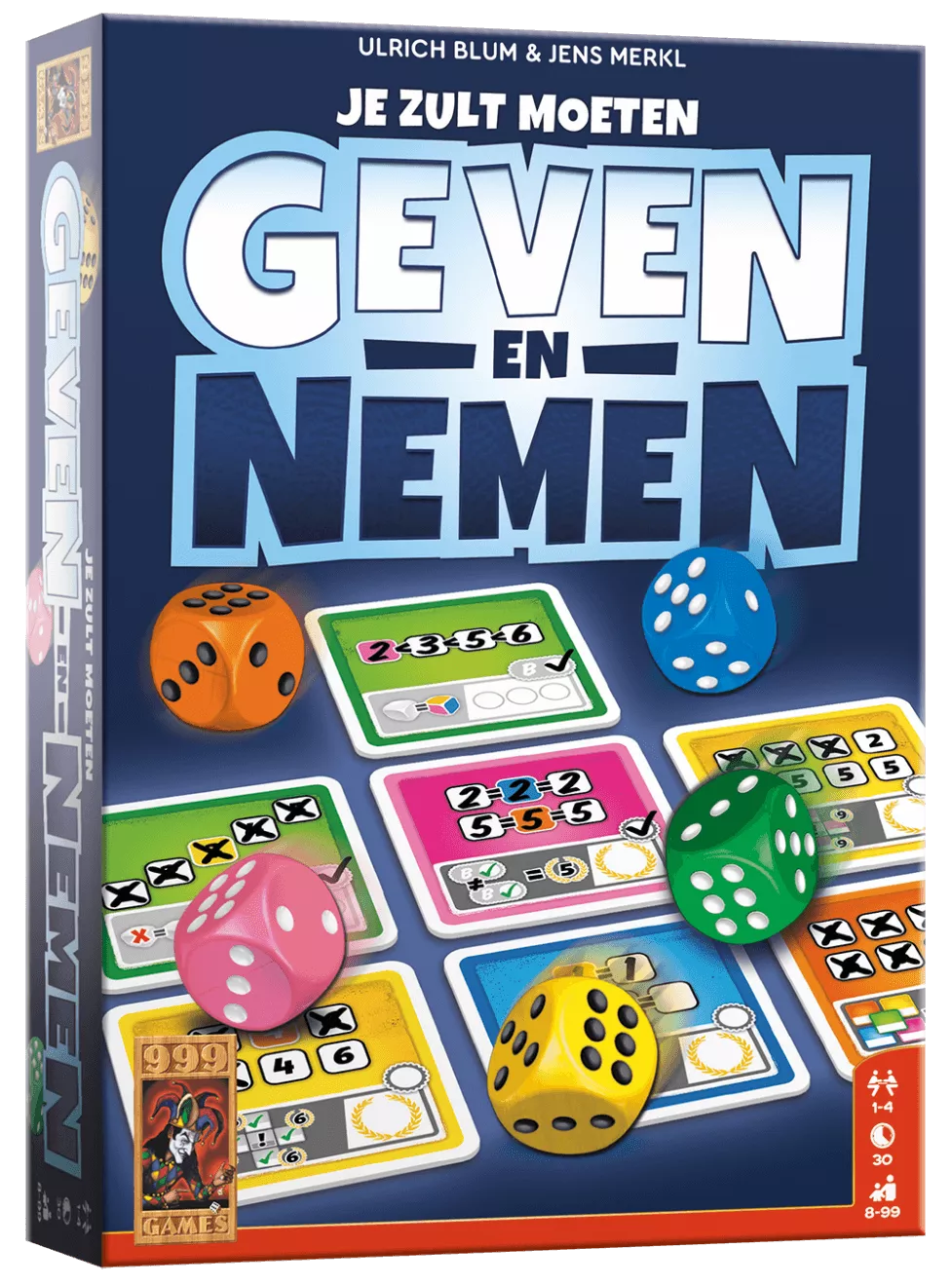 In dit dobbelspel probeer je de door jouw geworpen dobbelstenen slim in te zetten om een zo hoog mogelijke score te behalen. Tot zo ver niets nieuws toch? Bij Geven & Nemen heb je echter geen standaard scorevel, maar maak je dat zelf door in jouw beurt een van de kaarten van tafel te kiezen. Zo stellen alle spelers in de loop van het spel hun eigen, unieke speelveld samen. Kies de juiste combinatie van kaarten om je score te maximaliseren. In dit spel zijn alle spelers voortdurend bij het spel betrokken. Zo kun je er in je eigen beurt voor kiezen om de dobbelstenen opnieuw te werpen als het resultaat je niet bevalt. Maar bij elke tweede of derde worp mag iedere speler één van de dobbelstenen op zijn eigen kaarten invullen. Om verder te komen, moet je dus geven en nemen! Geven & Nemen is een soort Roll & Write 2.0. Een meeslepend spel dat geluk en tactiek handig combineert en een must is voor liefhebbers van bijvoorbeeld Clever en Keer op Keer. Spannend tot het laatste moment!