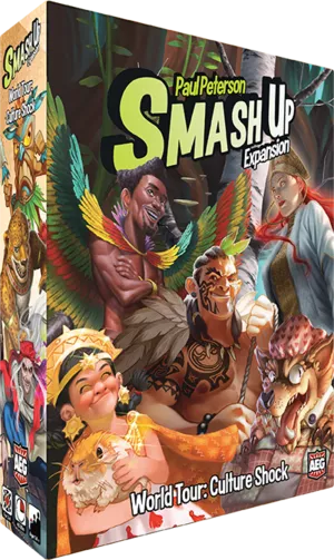World Tour: Culture Shock is the 17th Smash Up set (The Smash Up Penguins released before that is a promotional set and isn’t considered by AEG as a regular set.) It contains 5 new factions, 11 new bases, a rulebook, and VP tokens.