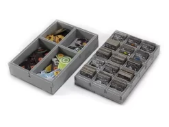 Insert compatible with Aeon’s End®, and includes space for numerous expansions, storing 840 sleeved or 1,300 unsleeved cards. Insert is also compatible with the Aeon’s End: War Eternal® and Aeon’s End: The New Age® games. The design provides both efficient storage and improved game play. Many of the trays can be utilised during the game, and they greatly aid set-up and clear-away times. The rules act as a lid on top of the trays. When used with the Aeon’s End: The New Age® version of the game the tray layout is slightly different. There are two large card trays. These have no base and are intended to remain in the game box. The trays have space for sleeved cards and the card dividers. the main large card tray. It is again with no base and should stay in the game box. All card slots are designed for sleeved cards and for the game’s card dividers. This tray also stores the yellow breach tiles. the last of the card trays is an unusual tray for Folded Space in that it is stored on it’s side in the box. The tray does have a base, and has space for sleeved cards. The card dividers do not fit this tray, but in any event we recommend using it for the crystal cards only, making it clear what it contains. The box for Aeon’s End: The New Age® has very slightly smaller internal dimensions meaning that the tray layout has to be adjusted for this version. Here the taller open token tray is not needed and is placed inverted in the bottom of the box as a filler tray. The other token trays are placed on top of it and can be slid out into the space for the player mats. We also recommend placing the crystal card tray inside the box first with the mats on top this time. When clearing the game away and packing the box, all the trays and mats are placed as shown followed lastly by the rule books. This fills the box to the top and allows for vertical storage of the game. This product consists of a flat-pack of 4 Evacore sheets. The trays require assembly, which is quick and fun, using ordinary PVA glue. Detailed instructions are included in the package.