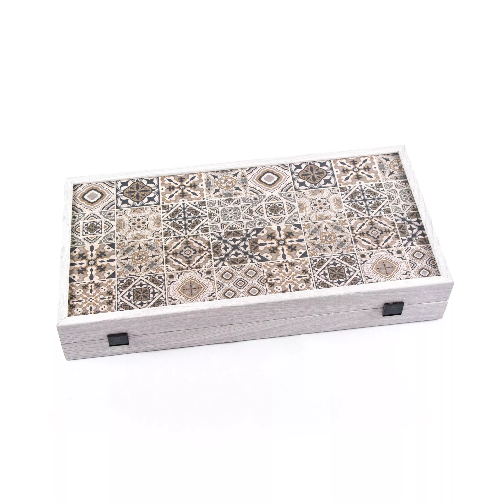 Dit backgammon is geïnspireerd op de Marokkaanse stijl, de nieuwe trend in decoratie. Marokkaans design wordt gekenmerkt door gedurfde, levendige kleurencombinaties grijs/zwart en de gelaagdheid van patroon en kleur door tegels, vloerkleden, lampen en meubels.