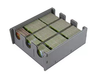 This Campaign 3 insert is designed to be compatible with Carcassonne® and the first five expansions to the game: Inns & Cathedrals®, Traders & Builders®, The Princess and the Dragon®, The Tower®, and The Abbey & Mayor®. The insert also includes three bonus trays for use in one of the expansion boxes to store the Count, King & Robber®, Bridges, Castles and Bazaars®, Hills & Sheep®, and Under the Big Top® expansions. With the top layer removed from the main game box you can see the second layer of trays underneath. Each meeple set has it’s own tray for its coloured components. The main map tile tray is designed to be able to stand vertically, sloping slightly backwards to hold the tiles in. This tray can then be used to organise all the tiles during the game. The map tile tray has a recess in the top which is for storing the tile bag that comes with the Traders & Builders expansion. The game boards and rules are placed on top of the insert trays acting as a lid. The game can be stored vertically, and transported easily as it fully fills the game box. The three bonus trays allow for storage of four of the remaining expansions in any of the expansion boxes sized 19 x 13.7 x 6.8 cm. These trays provide storage for the Count, King & Robber®, Bridges, Castles and Bazaars®, Hills & Sheep®, and Under the Big Top® expansions. There are two trays for tokens and meeples, and one large bottom-less tray for the additional tiles and the bridges. This latter tray should remain in the box to stop tiles falling out when removed. The map tile tray has space on top for the sheep bag. The trays then have a small space on top for the expansion rules and the large city tiles from the Count, King & Robber® expansion. When packed this box too can be stored vertically with the trays and rules filling the box. This product consists of a flat-pack of 4 Evacore sheets. The trays require assembly, which is quick and fun, using ordinary PVA glue. Detailed instructions are included in the package.