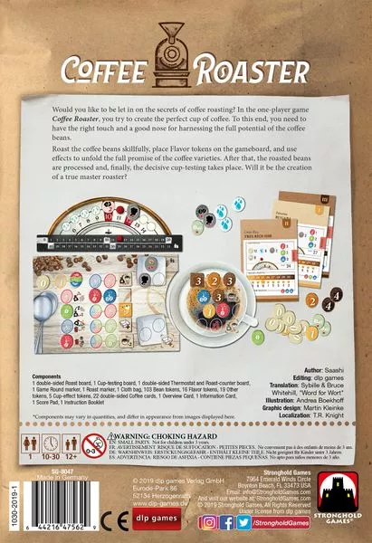Coffee Roaster is a solitaire pool-building game. You choose a variety of coffee beans you want to roast, and put a number of tokens specific to that variety into a bag. Each turn, you draw a number of bean tokens randomly from the bag to advance their roast level. When you are finished, you make a cup-testing to check the taste of your coffee and score points accordingly. Each variety has its own target roast level, but approaching the target is not enough for perfect roasting; you also have to even out the roast level of each bean, while not spoiling the flavor of that variety.