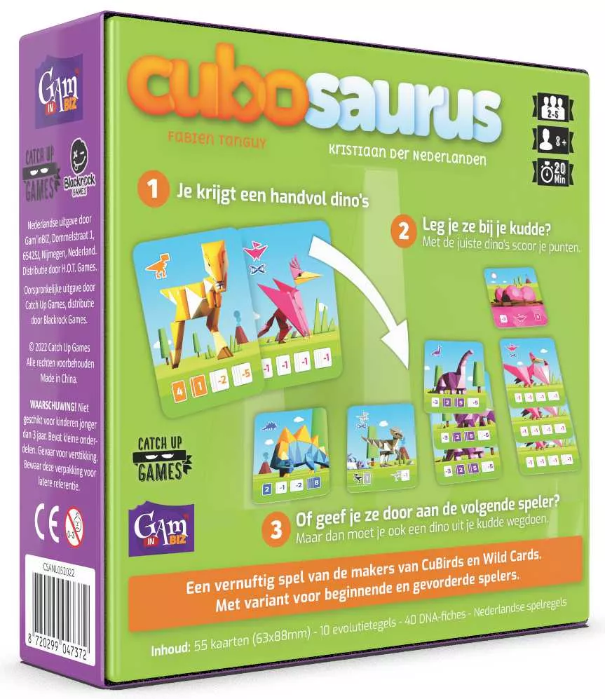 In CuboSaurus verzamel je dino’s. Met elke dino kun je op een andere manier punten verdienen, maar ook weer kwijtraken! Elke speler heeft een eigen strategie en heeft daarvoor bepaalde dino’s nodig. Soms wil iedereen dezelfde dino en dan is het hommeles! Als je aan de beurt bent, krijg je een of meer kaarten en moet je kiezen: wil je ze aan je kudde toevoegen of ga je ze aan de volgende speler doorgeven? Want meer dino’s is lang niet altijd beter! CuboSaurus is een vlot en leuk spel voor het hele gezin met in de hoofdrol voor iedereen herkenbare dinosaurussen. De keus waar spelers elke beurt voor staan – kaarten houden of doorgeven – maakt CuboSaurus voor veel spelers een unieke uitdaging. Cubosaurus is een vernuftig spel van de makers van de bestseller Cubirds en Wildcards. Met variant voor beginnende en gevorderde spelers
