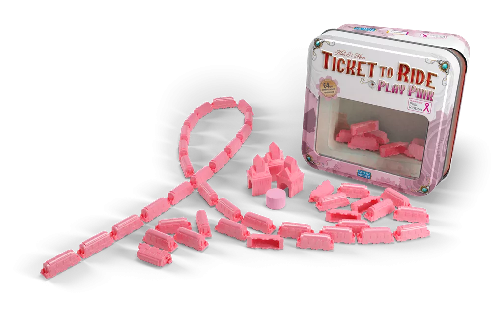 Play Pink is een speciale, roze treinset voor het bordspel Ticket to Ride! Maar Play Pink is meer: met deze exclusieve set (in de roze kleur van Pink Ribbon) zetten Asmodee en het Spellenhuis zich lokaal in voor de strijd tegen borstkanker.
