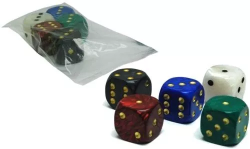 Dobbelsteen marmer/parelmoer groot in de kleuren wit, blauw, rood, groen en zwart. Kunststof Diameter 36 mm. Per 5 kleuren assorti in zakje.