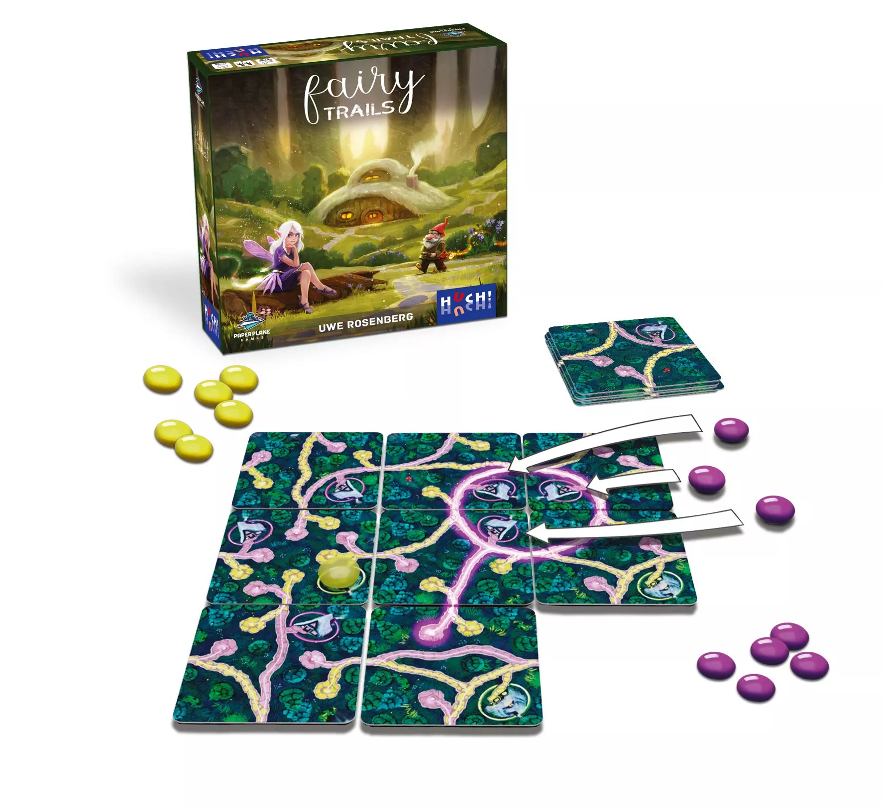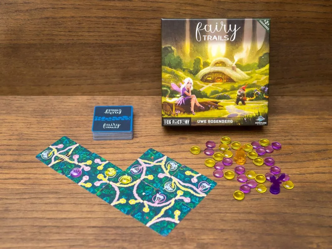 Het leven in het sprookjesbos is niet makkelijk. Elven en gnomen hebben allebei hun eigen netwerk van verborgen paden. Ze willen niet gestoord worden en kunnen alleen naar hun huizen terugkeren zodra deze beschermd zijn tegen buitenstaanders. Vind jij je weg door het sprookjesbos of raak je verdwaald?In Fairy Trails ben je een elf (roze) of een gnoom (geel). Je speelt kaarten om je netwerk uit te breiden. Zodra je een pad hebt voltooid, mag je een beschermsteen in je eigen spelerskleur plaatsen op je eigen huizen langs dit pad. De speler die als eerste al zijn beschermstenen op het speelbord kan plaatsen, wint het spel.