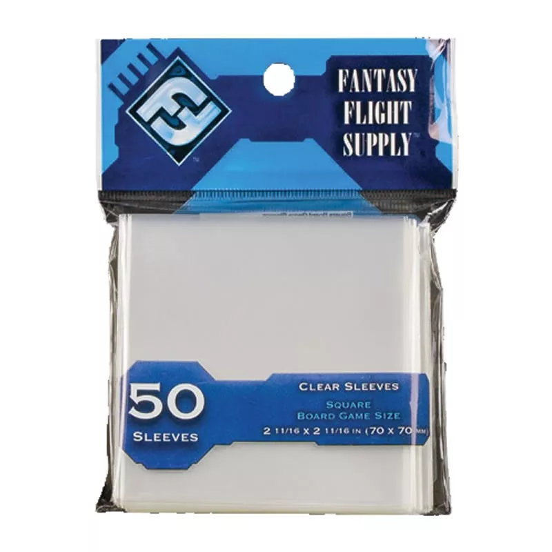 Transparante Deck Protectors voor vierkante kaarten (70×70 mm) zoals kaarten van Power Grid, Catan Card Game en Rivals for Catan. Een pakje bevat 50 deck protectors.