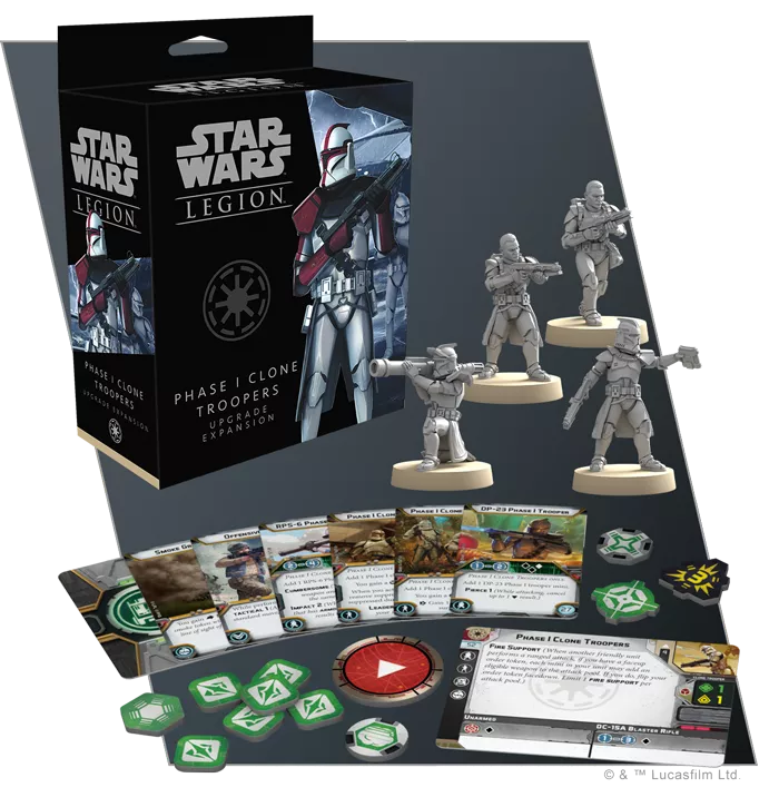 The Phase I Clone Troopers Upgrade Expansion contains four unpainted, finely sculpted soft plastic Phase I Clone Trooper miniatures to enhance your existing Phase I Clone Trooper units or to form one corps unit, along with new personnel and heavy weapon upgrade options.