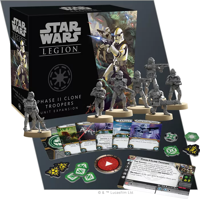- Dispatch an elite corp unit of Phase II Clone Troopers to the battles of the Clone Wars with seven new miniatures to add to your Star Wars: Legion collection!