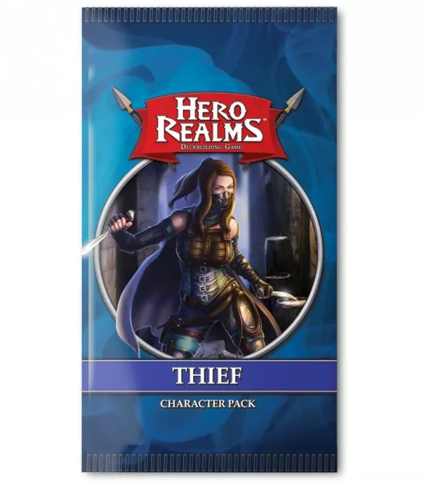 Play Hero Realms as a cunning Thief. Through sleight of hand, your enemies’ riches will become your own. Few can catch you, and those who do will soon feel the point of your knife! This Character Pack replaces a player’s personal deck in the Hero Realms Deckbuilding Game. Included are 15 cards: a Thief character card, the Heist and Pickpocket ability cards, two unique scorecards, and a new 10-card personal deck (2 Ruby, 3 Throwing Knife, and 5 Gold).