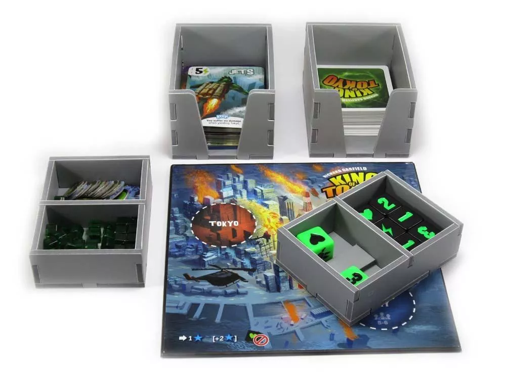 Note: insert designed for games with external box dimensions of 25.4 x 25.4 x 7.3 cm This insert is designed to be compatible with King of Tokyo©. The trays have space for the original game and the Power Up!© and Halloween expansions. The design provides both efficient storage and improved game play. Many of the trays can be utilised during the game, and they greatly aid set-up and clear-away times. The board and rules act as a lid on top of the trays. There is space for all cards to be sleeved. Insert features: One monster standee tray One monster board tray Two trays for cards Two trays for dice, cubes and tokens This product consists of a flat-pack of 4 Evacore sheets. The trays require assembly, which is quick and fun, using ordinary PVA glue. Detailed instructions are included in the package.