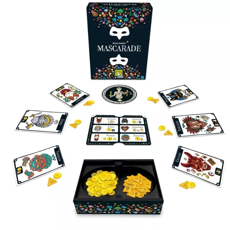 Wie ben jij in Mascarade? Wie je ook wilt zijn… tenminste totdat iemand anders je erop aanspreekt! Elk personage krijgt aan het begin van het spel een verdekte rolkaart en in een spel met 4-5 spelers worden enkele rolkaarten in het midden van de tafel gelegd. Tijdens een beurt voer je een van de volgende drie acties uit: