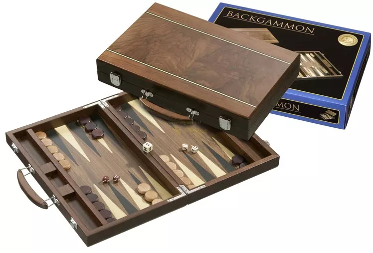 Medium backgammon koffer, walnotenhout en esdoorn, compleet met speelstenen, dobbelstenen. 385 x 246 x 70 mm.