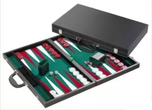 Als je deze grote backgammon Koffer op tafel legt dan ligt er ook echt wat. Hij is dus bedoeld voor de veel speler. De maten zijn 530 bij 320 bij 60 millimeter, als de koffer dicht is. De kleuren zijn traditioneel.
