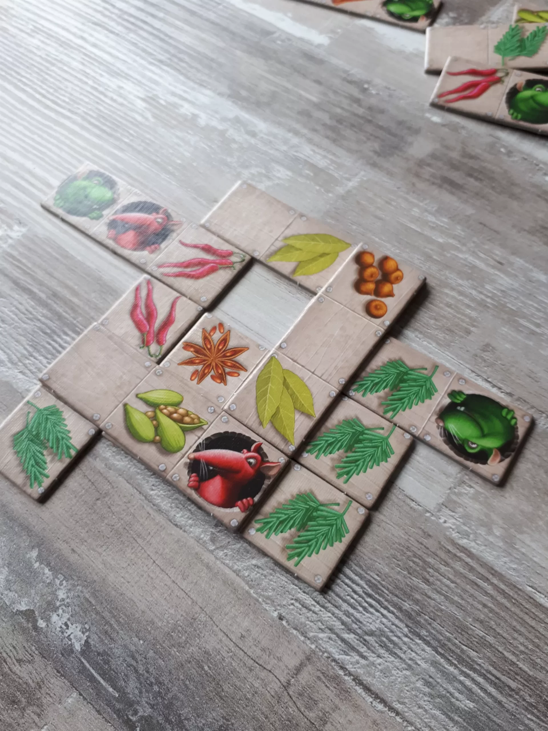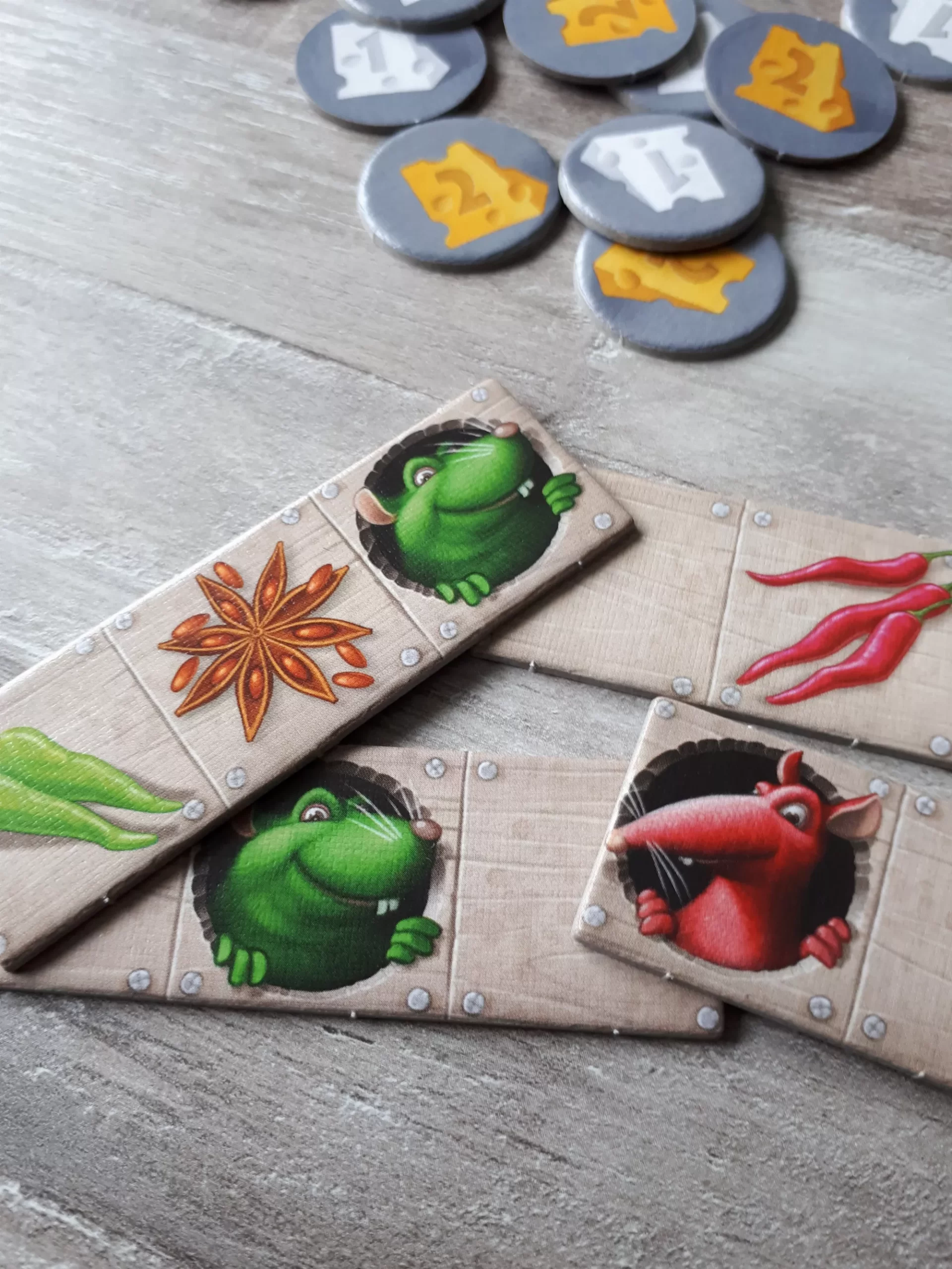 De ratten hebben hun ogen, oren en magen gericht op de voorraadkamers van twee kruiden en groente handelaren. De handelaren willen de juiste kleur kruiden en groenten op voorraad houden, maar ze moeten ook de ratten in de gaten houden.De kruiden, groenten en ratten zijn in twee kleuren willekeurig verspreid over de tegels. Als eenmaal de starttegel is gelegd, barst de spannende strijd los. Als je gelijke kruiden of groenten aan elkaar legt ontvang je direct punten. Maar pas op! Als de 3e rat in jouw kleur tevoorschijn komt verlies je het spel onmiddellijk. Jaag de ratten weg en leg de juisten tegels aan.Spannend en verslavend spel voor 2 spelers