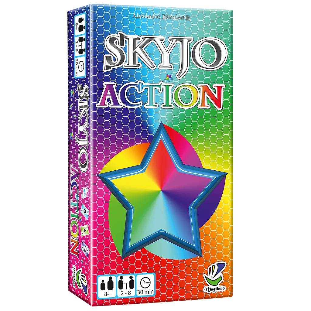 Skyjo Action adds (as the name suggests) Action Cards, which allow for special moves: Exchange cards in your tableu, Exchange cards between players, Steal an action card, Take two turns in a row etc. You get an action card whenever you put or reveal a Joker in your tableau, or you can take an Action Card instead of a normal move. Jokers allow for easier set collection and make very valuable sets in themselves (-10 or -15 points).