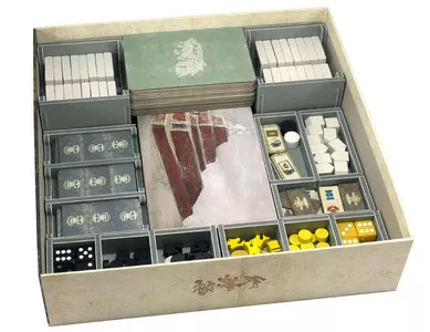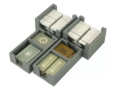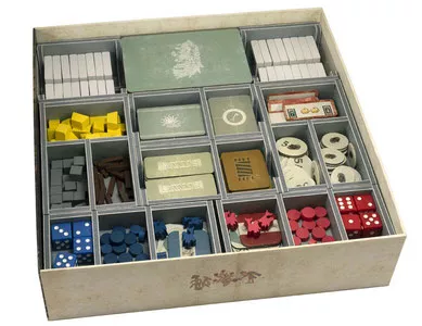 Insert compatible with Teotihuacan® and the Late Preclassic Period® expansion. The design provides both efficient storage and improved game play. The trays can be utilised during the game, and they greatly aid set-up and clear-away times. The rules and boards act as a lid on top of the trays. The insert is arranged in two layers. There are two trays for vertical storage of the pyramid tiles. Then two trays for the large tiles from the game: one for the technology and starting tiles, and one for the royal and season tiles. There is a tray for neatly stacking the discovery tiles, and a fourth tray for the buildings, decoration tiles, and the temple bonus tiles. The two calendar discs go in the slot for the temple bonuses. There are trays for the player pieces. Each tray has three slots, one for the dice, one for the wooden discs, and a slot for the player token, the multiplier token, and the player order token. This third slot also stores the wooden worshipers from the expansion. As mentioned above all the trays can be used during the game to organise the components and make access by all players easy. Using the trays in-game also makes clear-away times much quicker. The main game board placed first on top of the insert trays acting as a lid. Next goes the expansion board, followed lastly by the two rule books. Note that when fully loaded the box has a very small amount of lid-lift, which is between 1 and 2 mm.